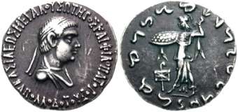 Bop 3A | Apollodotos II. 80-60 BC. AR Tetradrachm 26 mm, 9.74 g. BAΣIΛEΩΣ ΣΩTHΡOΣ KAI ΦIΛOΠATOΡOY AΠOΛΛOΔOTOY, diademed and draped bust right. / Kharosthi legend "Maharajasa tratarasa Apaladatasa", Athena Alkidemos walking left, brandishing thunderbolt and holding shield on arm. Kharosthi "stra" in right field, ΠIΔ monogram in left field. Bopearachchi 3A; Hoover HGC 389; Whitehead 276. | Text | Image |