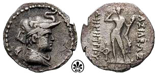 | Bop 4F | Baktria, Demetrios I AE Double Unit. Wreathed head of Herakles right, club over shoulder / BAΣIΛEΩΣ ΔHMHTΡIOY, Artemis standing facing, holding bow and drawing arrow; O on Ξ monogram in left field. BMC 13-14; SNG ANS 206-207. | Text | Image |