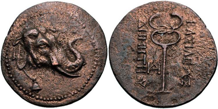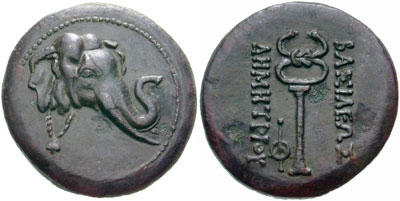 | Sear 7533 | Baktria, Graeco-Baktrian Kings. Demetrios I. Circa 200-185 BC. AE Triple Unit. Elephant's head right, with bell around neck / BAΣIΛEΩΣ ΔEMETΡIOY, caduceus; monogram to left. Bop 5C. | Text | Image |