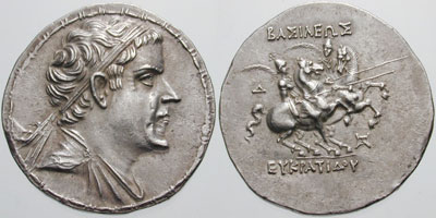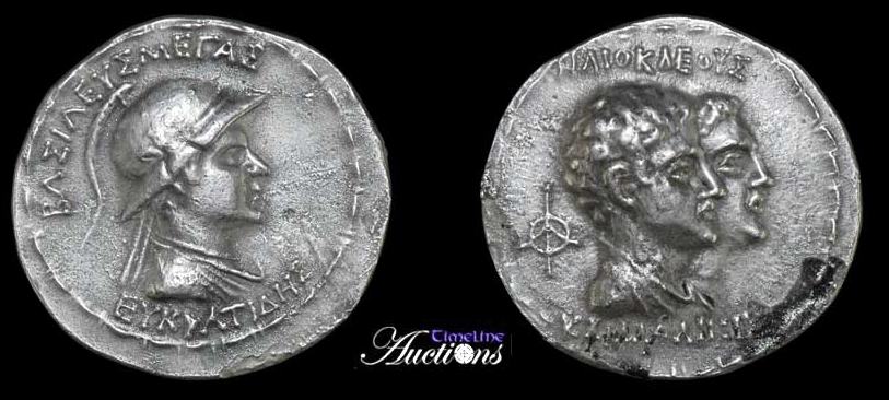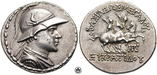 | Bop 6U | Eukratides I AR Tetradrachm. Helmeted, draped, and diademed bust right / BAΣIΛEΩΣ MEΓAΛOY EYKΡATΔOY, The Dioskuri on rearing horses right; monogram to right.