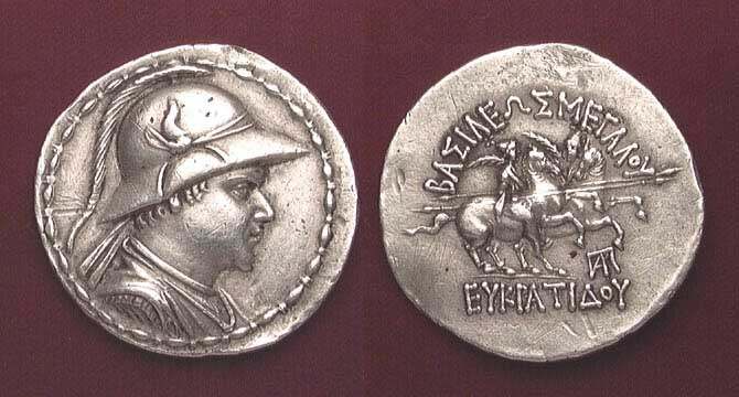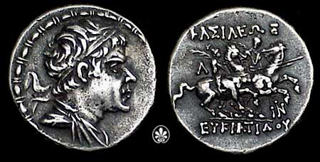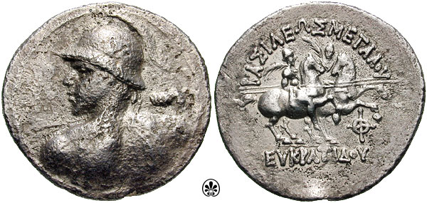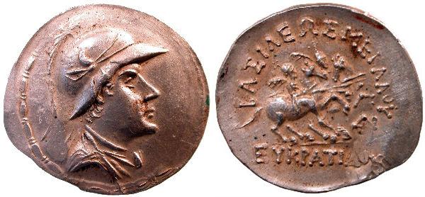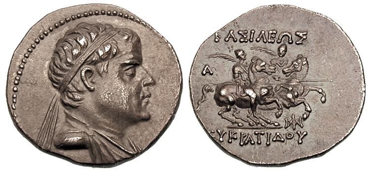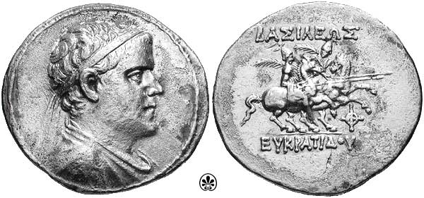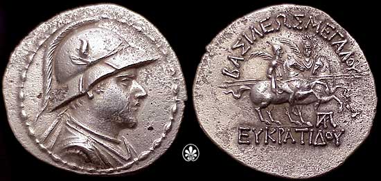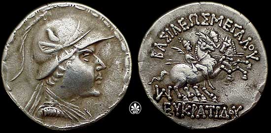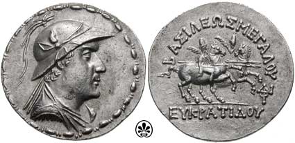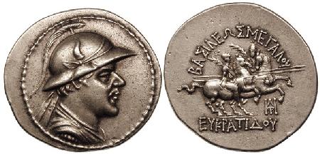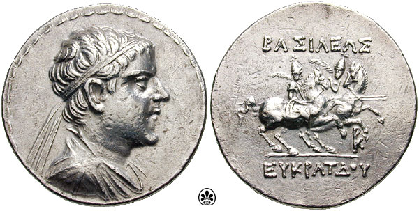 | Bop 6X | Eukradites I AR Tetradrachm. Helmeted, draped and diademed bust right / BAΣIΛEΩΣ MEΓAΛOY EYKΡATIΔOY, the Dioskuri on rearing horses right; monogram at right. | Text | Image |