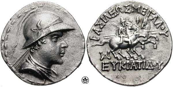 | Bop 6DD | Eucratides I (ca. 171-145 BC) AR tetradrachm. Diademed, draped bust right, in crested Boeotian helmet adorned with bulls horn / BAΣIΛEΩΣ MEΓAΛOY EYKΡATΔOY, Dioskuri charging right on horseback, each holding palm branch and couched spear, HΔYY monogram under horses' forelegs.
