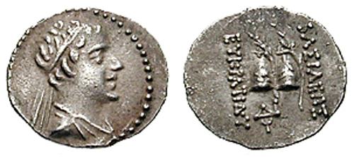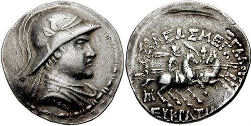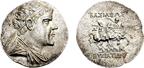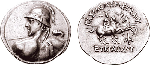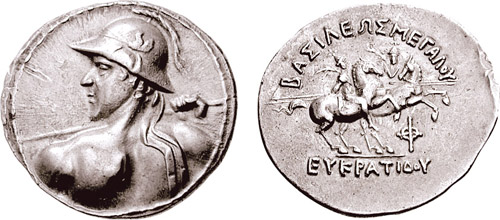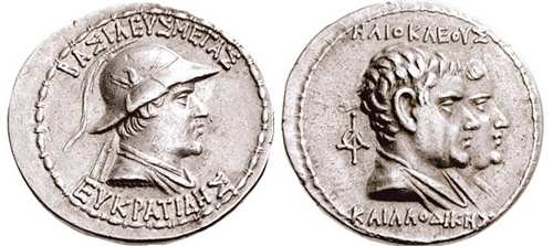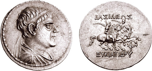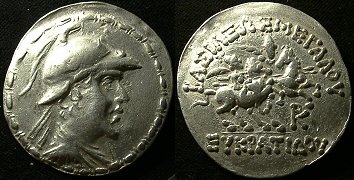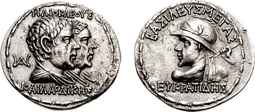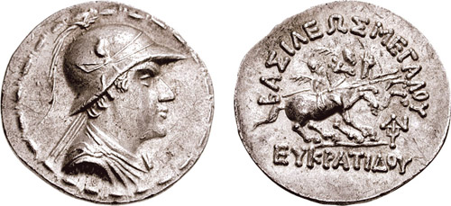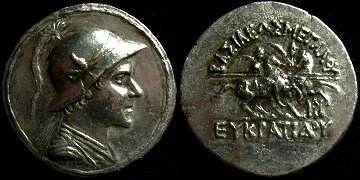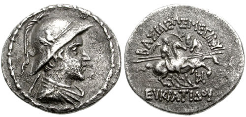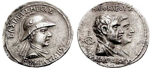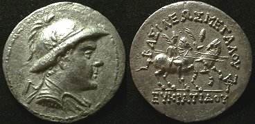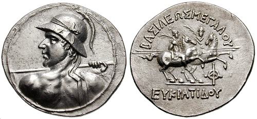 | Sear 7572 | Baktria, Indo-Greek Kings. Eukratides I. Ca 170-145 BC. AR tetradrachm. Merv mint. BAΣIΛEΩΣ MEΓAΣ EYKΡATIΔHΣ, Helmeted bust of Eukratides right, wearing crested helmet / HΛIOKΛEOYΣ KAI ΛAOΔIKHΣ, Jugate, draped busts of Heliokles and Laodike, diademed, right; monogram behind. Sear Greek 7572. | Text | Image |