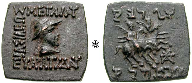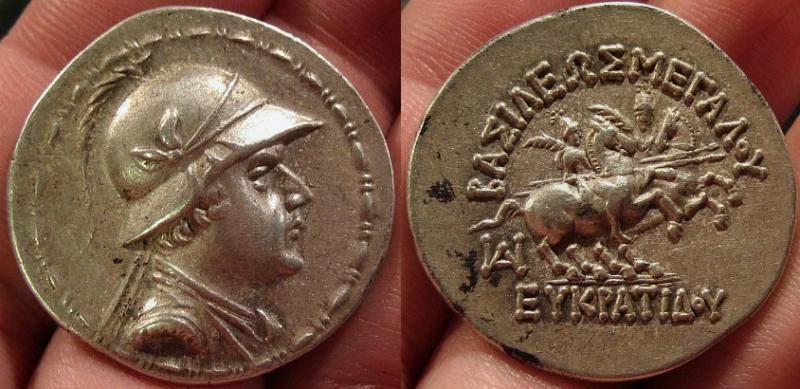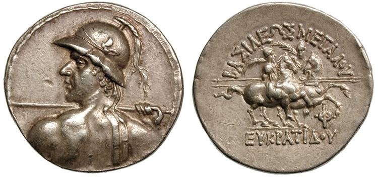 | Sear 7570 | Bactria, Indo-Greek Kingdom, Eukratides (171-135 BC) AR Tetradrachm. Merv mint. Draped bust right wearing ornamented crested helmet, filet border / BAΣIΛEΩΣ MAΓAΛOY EYKΡATIΔOY, the Dioskuri on horseback, prancing right, each holding spear and palm; ΠΦ monogram (Merv mint) below. MIG 177b, Mitchiner ACW 171i. | Text | Image |