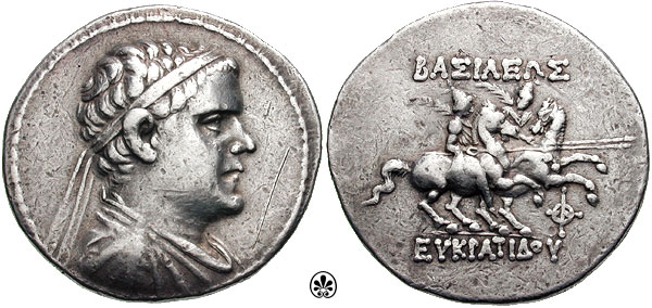 | Mitchener 1706 | Eukratides AR drachm. Diademed and draped bust right. / BAΣIΛEΩΣ EYKΠATIΔOY, The Dioskuri on horseback prancing right, each holding spear and palm, L behind.