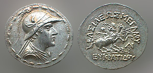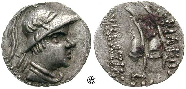 | Whitehead 63 | Eukratides, Baktrian king, 171-135 BC. AR tetradrachm. Diademed and helmeted bust right, wearing crested helmet adorned with the ear and horn of a bull. / BAΣIΛEΩΣ MEΓAΛOY EYKΡATIΔOY, the Dioskuri riding right, each holding a palm branch and a spear. ΡK monogram at lower right. Whitehead 63. | Text | Image |