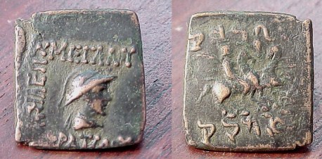 | MIG 190 | Eucratides c171 - 135 BC. AE Bilingual Rectangular Hemi-Obol. Pushkalavati Mint. Helmeted and draped bust of king right / Dioskuri with palms and spears mounted on horseback charging rt.