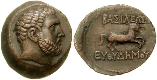 | Bop 22A | Euthydemos I Æ Double Unit. Bactra mint. Struck c215-208/206 BC. Bearded head of Herakles right / Prancing horse right. Kritt B3-A, SNG ANS 173. | Text | Image | Text | Image | Text | Image |