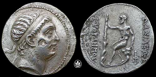 | SNG ANS 138 | Euthydemos I AR Tetradrach. Youthful, diademed head right / BAΣIΛEΩΣ EYΘYΔHMOY, naked Herakles seated left on a lionskin-covered rock, holding club. | Text | Image | |