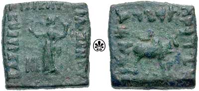 Bop_10HBaktria, Philoxenos. ca 100-95 BC. AE Square Hemiobol. City goddess standing left, holding cornucopiae in left hand, making gesture with outstretched right hand; monogram at feet left / Legend in Karosthi, humped Zebu bull standing right; [S] below. SNG ANS 1209. TextImage