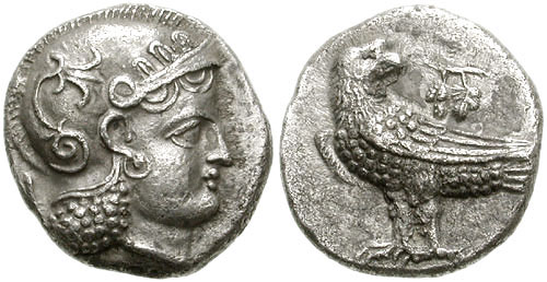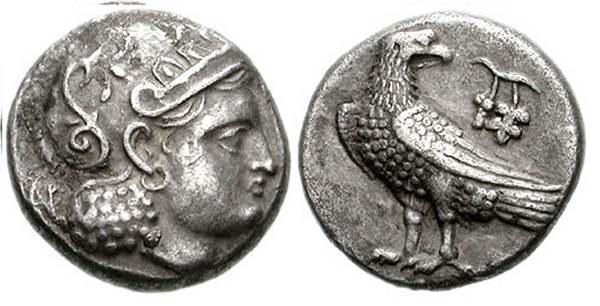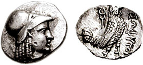 | SNG ANS 6 | Sophytes, Baktria, Pre-Seleukid Era. ca 305-294 BC. AR Didrachm. 19mm, 7.89 g. Head of Athena right, wearing crested Attic helmet decorated with three olive leaves over visor and a spiral palmette on the bowl; AΡ behind head / AΘE, Owl standing right, head facing; to left, curved back, prow of galley right above branch with grape bunch and leaf. SNG ANS 6; cf. MIG Type 24. | Text | Image |
