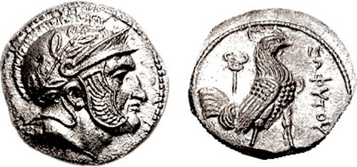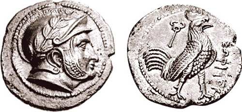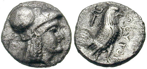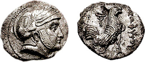 | SNG ANS 27 | Sophytes, Baktria. ca 325-300 BC. AR Diobol. Head of Athena right, in Corinthian helmet / ΣΩΦYTOY, rooster standing right, caduceus to left. MIG 31. | Text | Image | Text | Image |