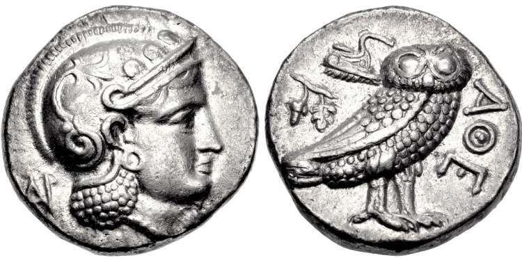 | Bop_1A | Sophytes, Baktria AR Tetradrachm. Circa 305-294 BC. Tetradrachm (16.79 g). Attic standard. Imitating Athenian tetradrachm. Head of Athena right, wearing crested Attic helmet decorated with three olive leaves and a spiral palmette on the bowl; behind, PA (retrograde) above prow left / AΘE, owl standing right, head facing; olive sprig, crescent, and grape bunch behind. SNG ANS 3cf. | Text | Image |