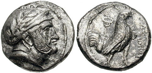 | Bop Notae 16 | Sophytes AV Stater. Ca 315-305 BC. 19 mm, 8.58 g. Laureate and helmeted head of Sophytes right, wearing crested Attic helmet with decorated cheek-guard, MNA on neck truncation. / ΣΩΦYTOY, caduceus with knot in centre and dragon head terminals. Bop. Notae 4, 16 (this coin); Jansari 68 in NC 1978. | Text | Image |