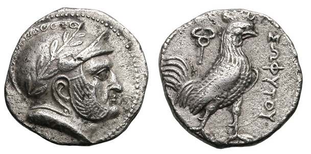 | SNG ANS 21 | Sophytes, Baktria. ca 325-300 BC. AR Drachm. Male head right in crested helmet; M on base of neck / ΣΩΦYTOY, rooster standing right, wings closed; caduceus at left. | Text | Image | Text | Image | Text | Image |