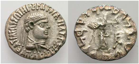 | Bop 2A | Strato I AR Drachm. Diademed bust right / Karosthi legend, Athena left brandishing thunderbolt & holding shield, monogram to right.