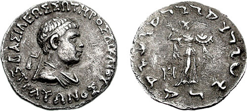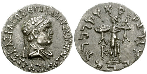 | Bop 11A | Baktria, Strato I AR Tetradrachm. BAΣIΛEΩΣ ΣΩTHΡOΣ NIKΩIOY, ΣTΡATΩNOΣ below, diademed & draped bust right / Karosthi legend, Athena Alkidemos walking right; monogram to left.