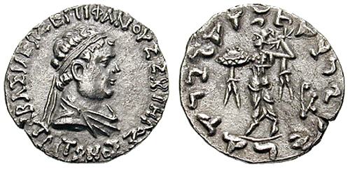 | Bop 27A | Baktria, Strato I AR Drachm. ca 125-110 BC. Indian standard. Diademed & draped bust right / Athena Alkidemos standing left, brandishing shield & thunderbolt; PK monogram before. SNG ANS 1002, MIG 331a.