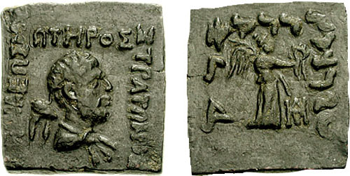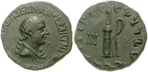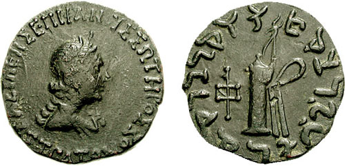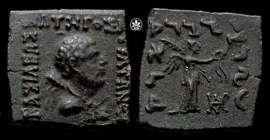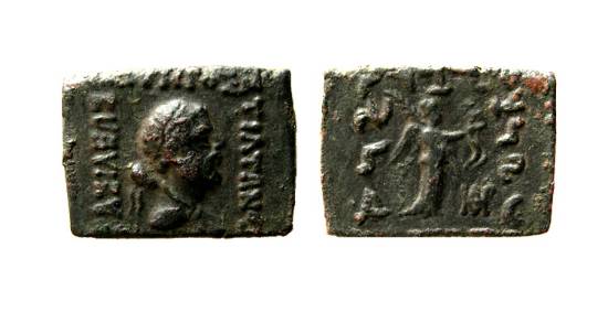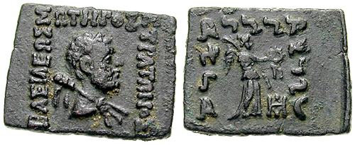 | Bop 29C | Strato I. Circa 125-110 BC. AE 17mm x 20mm. Bust of Herakles right, club over shoulder / Nike walking right, holding wreath & palm; monogram before. SNG ANS 1016.