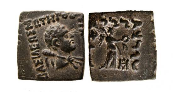 | SNG ANS 996 | Strato I AR Tetradrachm. Indian Standard. Helmeted bust right / Athena Alkidemos standing left, holding shield & hurling thunderbolt.