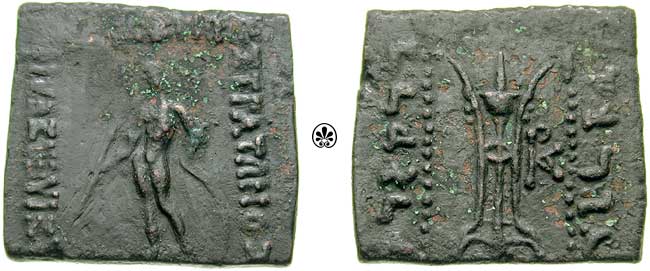 | Bop 31v | Strato I, ca 125-110 BC, AE Quadruple Unit. BAΣIΛEΩΣ ΣTΡATONΩΣ, Apollo standing facing, holding bow & arrow / Tripod; monogram to right. MIG 336a.