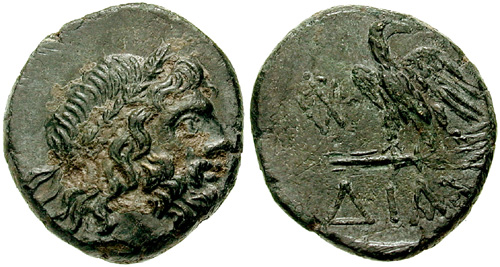 | RecGen 5A-1bis | Dia, Bithynia, civic issue, AE 18.4 mm. 95–90 BC or 80–70 BC. Laureate head of Zeus right. / ΔIAΣ beneath eagle standing half-left on thunderbolt, head turned right. HTΡ monogram in left field. RecGen 5A-1bis (Waddington's hand-written addition in the Paris BNF example of RecGen); Type Hoover HGC 453; BMC -; BMC Black Sea -; SNG France 7 -. | Text | Image |
