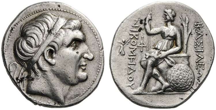 | RecGen 2 | Kingdom of Bithynia, Nikomedes I AR Tetradrachm. ca 280-250 BC. Nikomedia mint, ca 260-250 BC. Diademed head right / BAΣIΛEΩΣ NIKOMHΔOY, The warrior goddess Bendis seated left on a rock, holding two spears; shield below; Nike walking left in outer left field. No monogram. RecGen 2. | Text | Image |