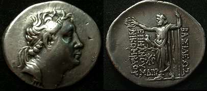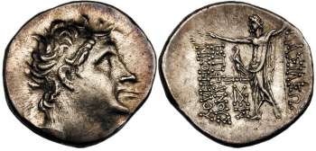 | RecGen 59 | Nikomedes III, Kingdom of Bithynia AR Tetradrachm. Dated 184 of the Bithynian Era = 114-113 BC. Diademed head right / BAΣIΛEΩΣ EΠIΦANOYΣ NIKOMHΔOY, Zeus standing left, holding wreath in right hand, lotus tipped sceptre in left; to inner left, eagle on thunderbolt above Koppa-MHΛ monogram and ΔΠΡ (date). RecGen 59; Waddington 591. | Text | Image |