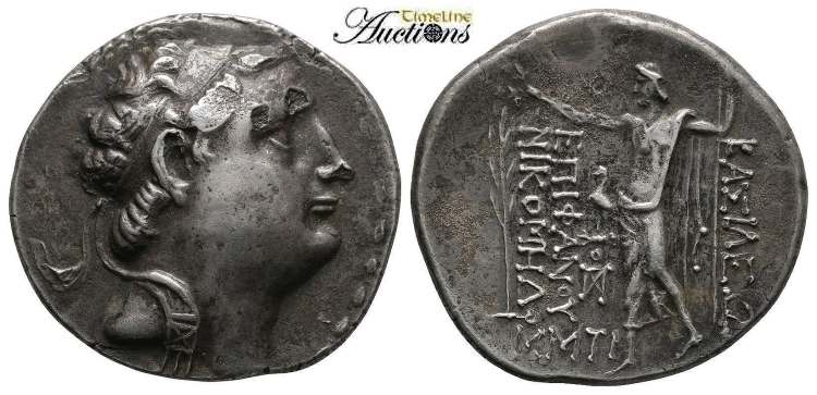 | RecGen 230v | Nikomedes III, Kingdom of Bithynia AR Tetradrachm. Dated 177 BE (121/0 BC). Diademed head right / BAΣIΛEΩΣ EΠIΦANOYΣ NIKOMHΔOY, Zeus standing left, holding wreath in right hand, lotus tipped sceptre in left; to inner left, eagle on thunderbolt above monogram ΞOΡ (date). | Text | Image |