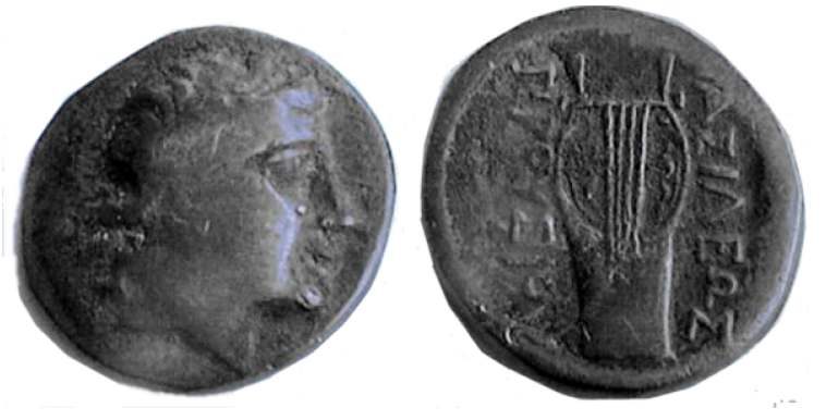 | RecGen 18 | Kingdom of Bithynia, Prusias I AE19. Laureate head of Apollo right / BAΣIΛEΩΣ ΠΡOYΣIOY, lyre with four strings. RecGen 18; BMC 8; Sear 7264. | Text | Image |