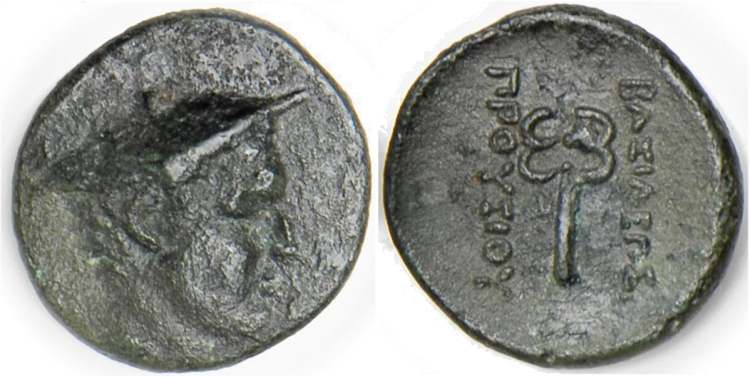 | RecGen 22 | Prusias I, King of Bithynia. AE14. 230-187 BC. Head of Hermes right, wearing petasos. / BAΣIΛEΩΣ ΠΡOYΣIOY, caduceus. RecGen 22-23; BMC 19 (Prusias II). | Text | Image |