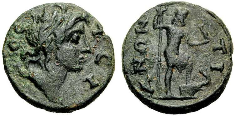 RPC 702 | Δomitian, AE22 of Tium, Bithynia. 81-96 AΔ. AYT &Δelta;OMITIANOΣ KAIΣAΡ ΣEB Γ, laureate head right / ZEYΣ ΣYΡΓAΣTHΣ TEIANΩN, Zeus Syrgastes standing left, holding patera and sceptre. RPC 702; RecGen 22. | Text | Image |