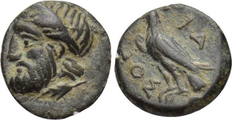 SNG Tubingen 2151 | Tium, Bithynia, AE10, civic issue, ca 350-300 BC. Laureate head of Zeus left, corn-ear beneath neck. / TIANOΣ, eagle standing left with closed wings. SNG Tübingen 2151. | Text | Image |