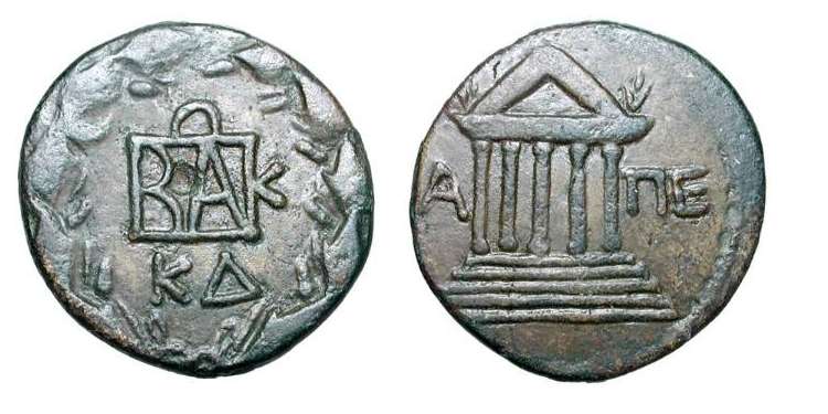 | Anokhin 370 | Rheskuporus I, Bosporos, AE24. AD 68-79 AD. 5.99 mm. ΩΠBAK monogram, KD below, all within wreath / KA-PE, Pentastyle temple (five columns) with four steps and a base. Anokhin Bosporos 370. | Text | Image |