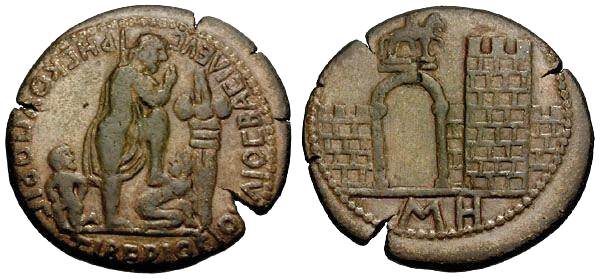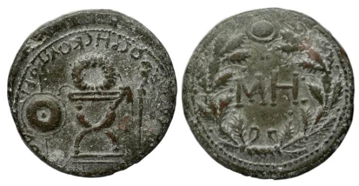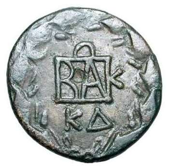 | Anokhin 377 | Rheskuporis II AD 68-92, AE30 (48 Nummi). Struck AD 80-90. TIBEΡIOY IOYΛIOY BACIΛEΩC ΡHCKOYΠOΡIΔOC, wreath on curule chair, shield and spear to left, sceptre surmounted with the king's head to right. / MH within wreath. Anokhin 377; Paris 137; SNG Cop 35; Kotschoubey 16; Mionnet I, 41-42. | Text | Image |