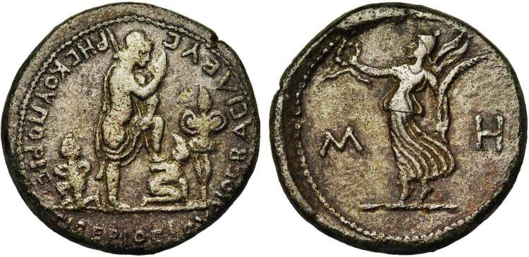 | Anokhin 380 | Rheskuporis I, Bosporos. AD 69-93. AE28. 7.87 g. ΡECKOΠOYΡIC TIBEΡIOC IOYΛIOC BACIΛEYC anti-clockwise from top left, king in military dress, standing right, holding spear, trophy to right, his left foot on a kneeling, bound captive and another kneeling, bound captive behind him. / M-H (value mark), Nike standing left, holding wreath and palm branch. Anokhin 380; RPC 473; Frolova, pl. 3, 10; SNG Stancomb 976. | Text | Image |