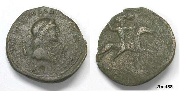 | Anokhin 488 | Kingdom of Bosporus, Rhescuporis II AE27. Diademed bust right, trident before, club behind / warrior on horseback right, hurling spear. | Text | Image |
