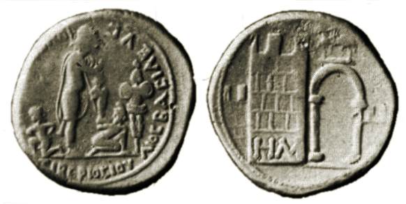 | Lederer 37 | Rheskuporis I, Bosporos. AD 69-93. AE28. 12.15 g. (ΡECKOΠOYΡIC) TIBEΡIOC IOY-ΛIOC BACIΛEYC anti-clockwise from top left, king in military dress, standing right, holding spear, trophy to right, his left foot on a kneeling, bound captive and another kneeling, bound captive behind him. / City wall with three turrets beside an arched gateway surmounted by an equestrian statue left. Value mark HM at the bottom of the wall. Lederer 37 in SNR 30; Frolova I, 3. Anokhin 381 var (positions of arch and statue) | Text | Image |