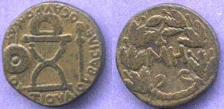 | Ahokhin 456 | Kingdom of Bosporus, Sauromates I AE25mm 48 Nummia. 90-124 AD. BACIΛΛEΩC CAYΡOMATOY, Chair surmounted by crown, between shield and spear on left and human-headed sceptre on right / MH, denomination within wreath. BMC 25, SGI 5457.