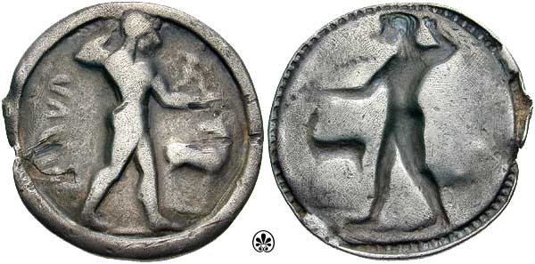 | Sear SG 252 | Kaulonia, Bruttium. AR Nomos or Stater. ca 520 BC, Achaean standard (8.14 g). Apollo, nude, his hair bound with taenia, advances right, brandishing a laurel(?) branch in his upraised hand, & supporting in his outstretched hand a small running figure, his head turned back, regardant, & also holding a branch in each hand; stag standing to right on dotted ground / incuse of obverse. BMC 9, SNG ANS 141. |