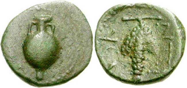 | Garrucci 22 | Lokroi Epizephyrioi, Bruttium, AE12. ca 3rd century BC. 0.96 g. Amphora. / Bunch of grapes. Garrucci 22; Pellicano 276-278. | Text |  |