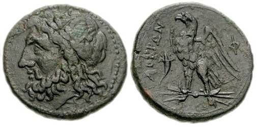 | SNG ANS 536 | Bruttium, Lokri Epizephrioi AE 22mm. ca 300-268 BC. Laureate head of Zeus right / eagle standing left on rock. Rutter, HN 2352, SNG Copenhagen 1872.