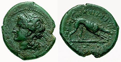 | SNGANS 561 | Campania, Nuceria Alfaterna. Circa 250-225 BC. AE 16mm. Young male head left / Dog feeding right. Rutter HN 610. | Text | Image |