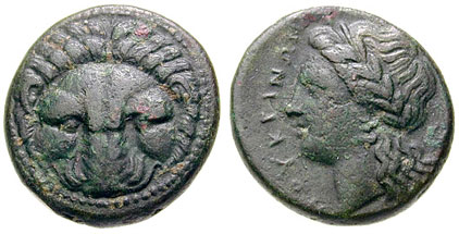 | SNGMorcom_443 | Bruttium, Nuceria. ca 300 BC. AE Obol. Facing lion's head / NOYKΡINΩN, laureate head of Apollo left. | Text | Image |