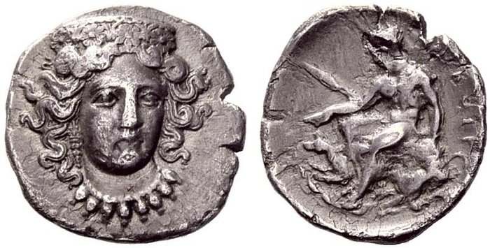 The site of this town is still unknown. Struck only silver coins ca 435-425 BC. Coins from Pandosia are very rare.