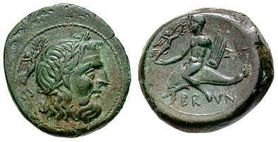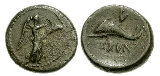 | HN Italy 741 | Brundisium, Calabria, ca. 215 BC. AE 1/8 Uncia (11mm, 1.21 gm). Nike advancing right, holding wreath and palm / BRVN beneath Dolphin left; L above. SNG Copenhagen 717; HN Italy 741. | Text |  |