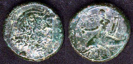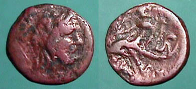 | BMC 155 | Brundisium, Calabria, AE22. Laureate head of Poseidon right, crowned by small Nike, trident behind / Taras seated on dolphin left, holding Nike and lyre. BMC 5 var. | Text |  |