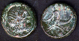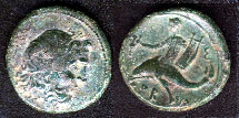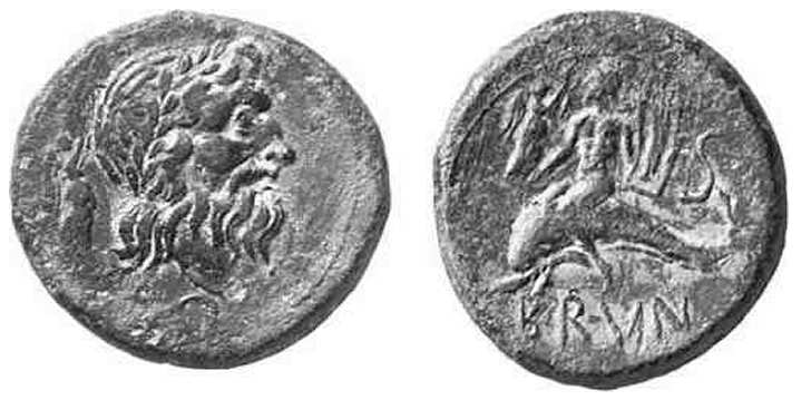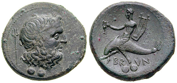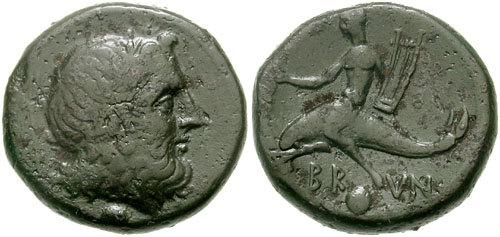 | AEUncia | CALABRIA, Brundisium. Circa 215 BC. AE Uncia. Laureate head of Poseidon right; trident & wreath-bearing Nike behind / BRVN, youth on dolphin left, holding wreath-bearing Nike in right hand, cithara in left; star behind. | Text |  |
