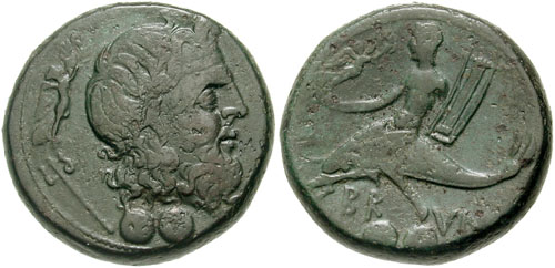 | Weber 492 | CALABRIA, Brundisium. Circa 215 BC. AE Sextans. Laureate head of Poseidon right; trident behind, two dots below / BR-VN, youth on dolphin left, holding kantharos in right hand, cithara in left; two dots below.