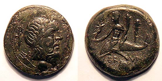 | BMC 155.1 | Brundisium, Calabria, AE22. Laureate head of Poseidon right, crowned by small Nike, trident behind / Taras seated on dolphin left, holding Nike and lyre. BMC 5 var.